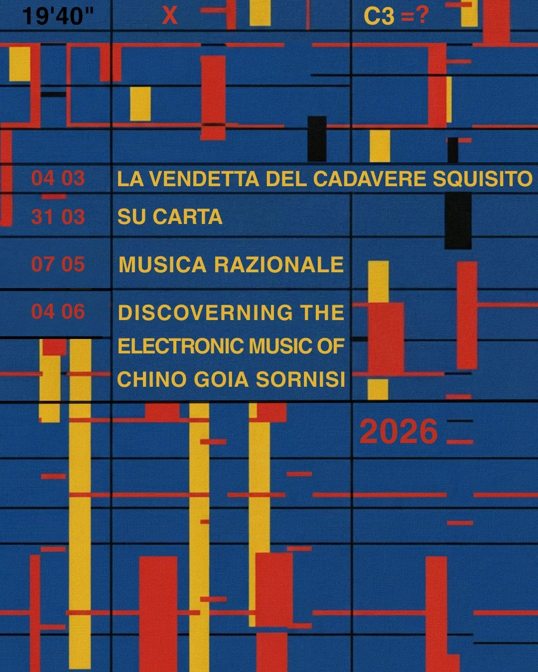 I nostri appuntamenti a C3 non sono finiti: torneremo il 31 Marzo per Su carta: la musica di Francesco Fusaro prende corpo dal vivo con Esecutori di Metallo su Carta, tra segno, gesto e spazio. Un invito a superare i confini tra compositore, interprete, ascoltatore e ambiente. Ci saranno Francesco Fusaro, Enrico Gabrielli, Sebastiano De Gennaro e altri ospiti. Potete scriverci un DM per sapere dov’è C3 e per prenotarvi.